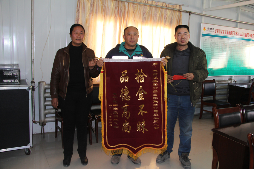 2012年12月12日上午,内蒙古阿拉善左旗巴彦浩特镇汽车运输司机张明辉夫妇一行8人专程到内蒙古太西煤集团金昌鑫华焦化公司,为洗煤车间员工王之智送上了“品德高尚、拾金不昧”的锦旗、感谢信。
