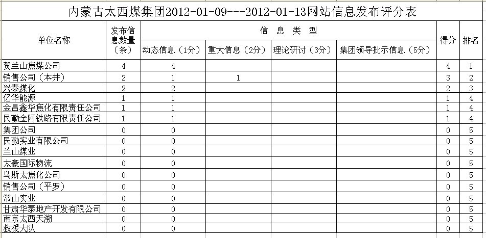 内蒙古太西煤集团2012-01-09---2012-01-13网站信息发布评分表