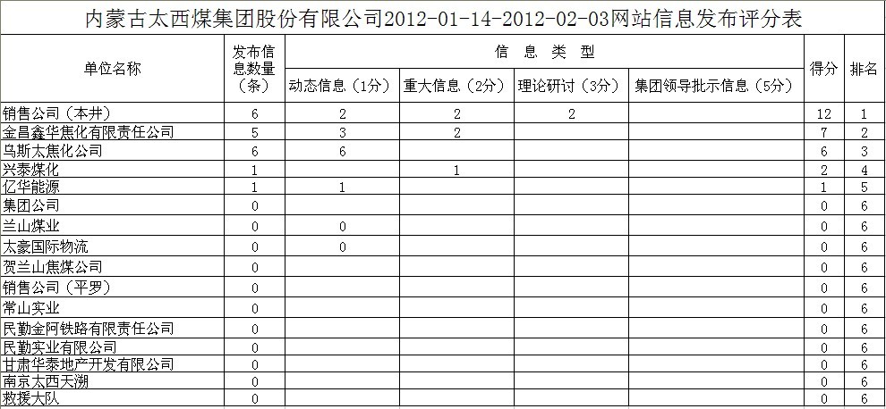 内蒙古太西煤集团股份有限公司2012-01-14-2012-02-03网站信息发布评分表