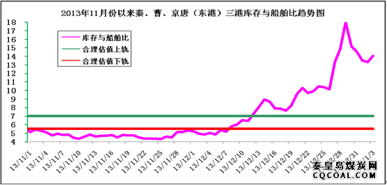 其三,主要发运港口的煤炭库存指标已经“下压”煤价。监测表明,2013年12月中旬之后,秦皇岛、曹妃甸和京唐港(东港)三港的“煤炭库存与船舶比”指标(见图。合理估值:5.5-7.0;大于7.0时偏高,煤价承压:小于5.5时偏低,煤价受托)就已经迅速上穿合理估值的上轨,并呈现持续拉高态势,对该地区动力煤价格下行的压力不断增强,也是促使本期该地区动力煤交易价格回落的主要原因之一。