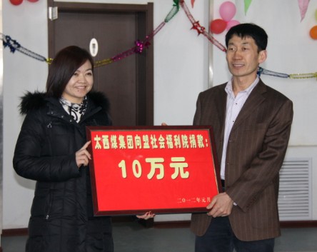 2012年1月21日,内蒙古太西煤集团公司总裁、党委副书记王海霞、工会主席曹秀兰、党委工作部部长郝华随同盟民政局领导一行,踏着厚厚的积雪前往阿盟社会福利院进行春节慰问,亲切看望生活在福利院的孤残儿童,向该院捐赠10万元慰问金。并代表太西煤集团公司对孩子们和工作人员表示节日的问候和新年的祝福。此次活动是太西煤集团公司自2007年以来第七次到社会福利院开展捐赠慰问活动,这项活动仅是太西集团公司各项公益行动中平凡而真切的一个缩影,1997年以来太西煤集团公司已累计为社会各界捐助善款3000多万元。