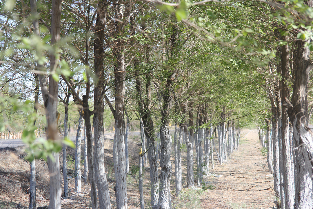 本井讯:近日,为防止栽植树木被病虫害和散放牲畜破坏,销售公司为道路两侧和本井洗煤厂内防护带栽植树木刷白灰、农药。郁郁葱葱的树木犹如穿上了白色的“防护裙”,为乌兰布和沙漠增加了一道亮丽的风景线。