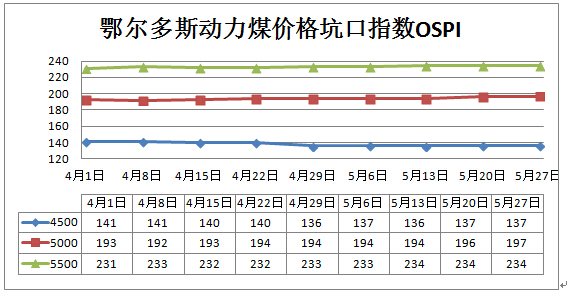 从4月初到5月底,鄂尔多斯动力煤价格指数主唱“持平”,数据显示:从4月1日至5月27日累计9期指数结果,4500大卡动力煤规格品跌幅为4元/吨,3期持平;5000大卡动力煤规格品涨幅4元/吨,连续4期持平;5500大卡动力煤规格品涨幅为3元/吨,4期结果持平。