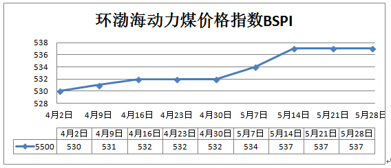 环渤海动力煤价格指数与产地价格指数似有夫唱妇随之势,从4月2日至5月28日累计9期结果:5500大卡动力煤涨幅为4元/吨,6期指数结果持续形成两大价格平台。环渤海六个港口中,24个港口规格品中价格持平的由6个增加到19个。