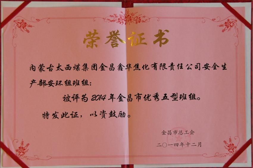 日前,金昌鑫华焦化公司安全生产部安环组受到了金昌市总工会的表彰,荣获“金昌市优秀五型班组”称号。公司各班组进一步掀起了以先进为榜样,积极学习先进班组典型经验的竞赛活动,为推动公司科学发展,安全发展、和谐发展发挥了积极作用。