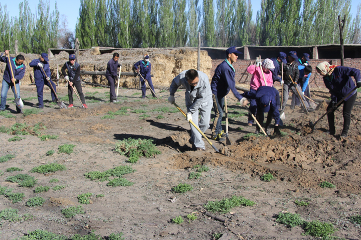 4月21日,销售公司组织全体员工开展义务劳动,对养殖场内荒地进行翻地、除草,种菜绿化。