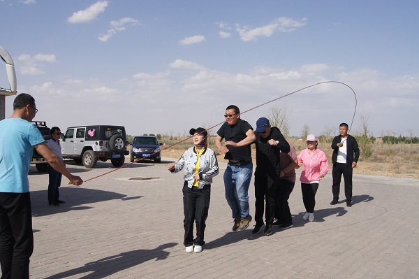 然后驱车到太西煤腾格里沙漠生态园,到达植树现场后,大家以事先分好的小组为单位,迫不及待地行动起来,挥锹挖坑,培土固沙,配合默契,一气呵成,现场一派热闹气象。植树完成后,展开野餐烧烤、游戏拓展,在此过程中,穿插了党的十九大精神和习近平重要讲话的学习宣读,大家积极参与,互相配合,合作竞争,现场气氛非常活跃,展现了拼搏的团队精神,环保意识贯穿活动全程,每个人都主动回收垃圾,不留一片污染物。