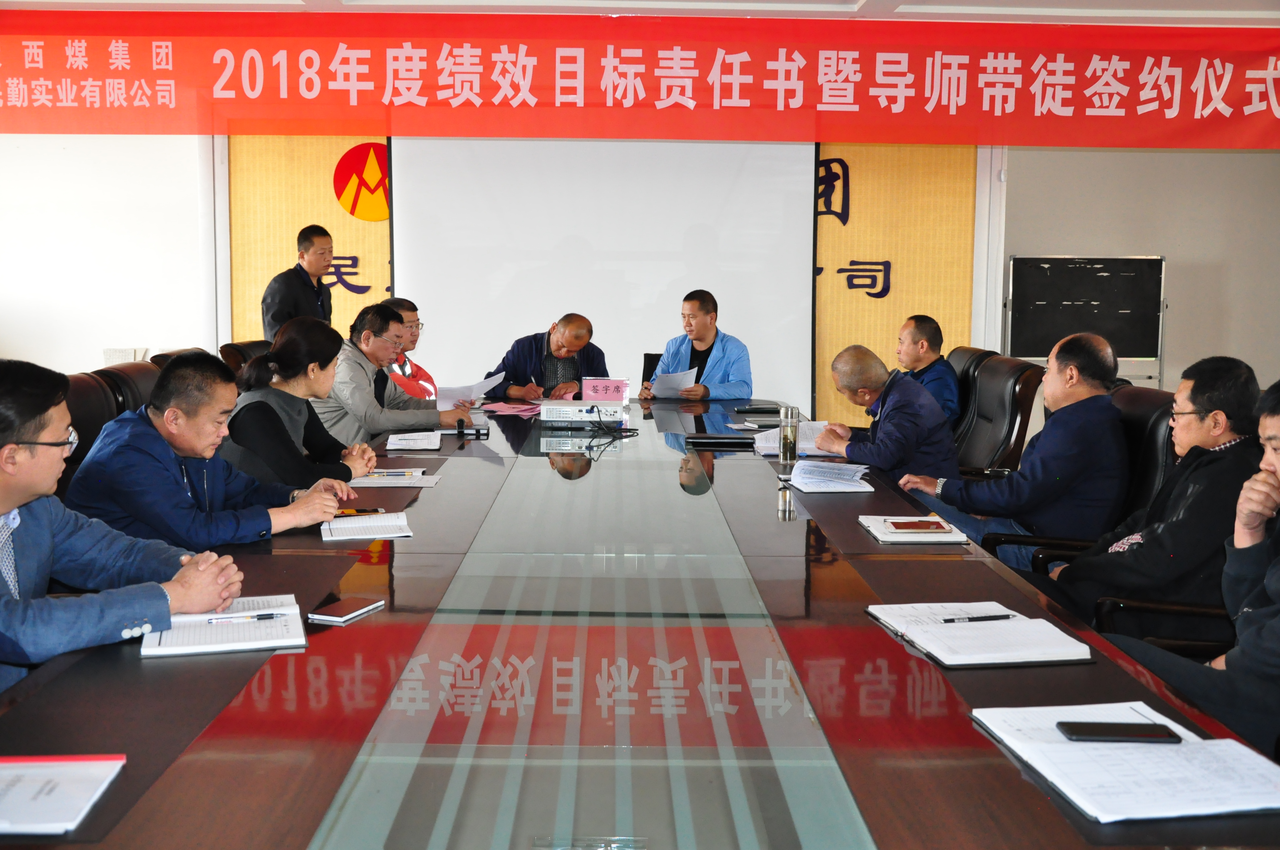 四楼会议室总经理王俊与各分管副总、矿长,副总经理与相关部室签订了《2018年度绩效目标责任书》。