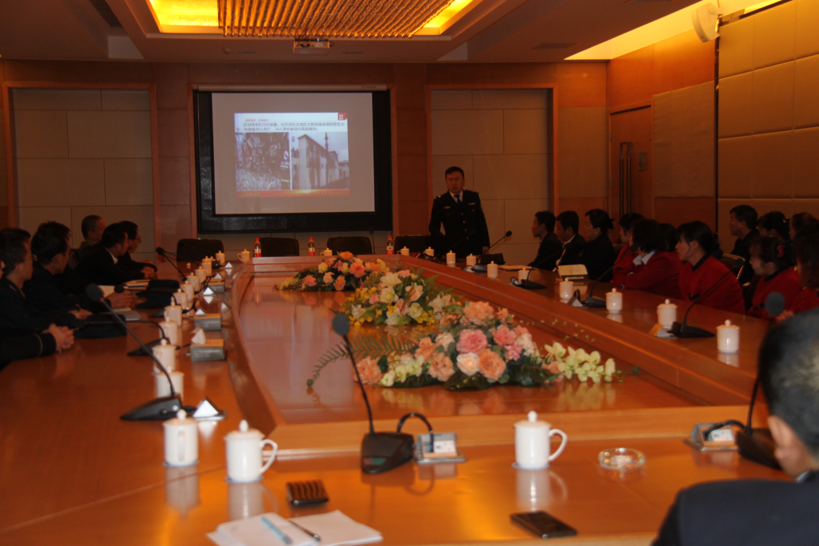 随后,组织工程及安保人员到酒店消防控制室进行了现场授课,主要内容包括:消防控制系统的工作原理、控制面板的操作流程、湿式报警阀的工作原理、喷淋及消火栓系统的操作及运行原理等。