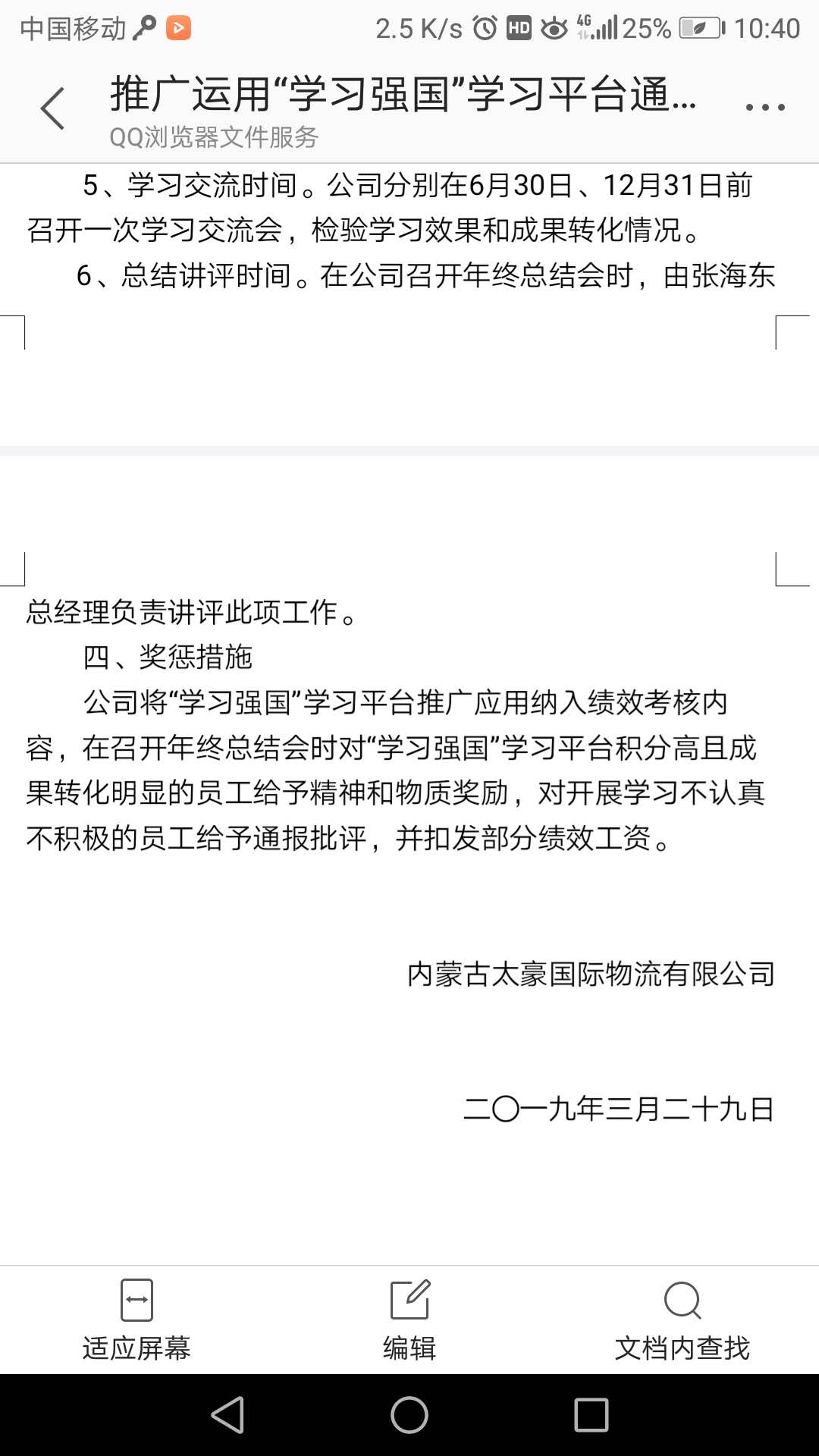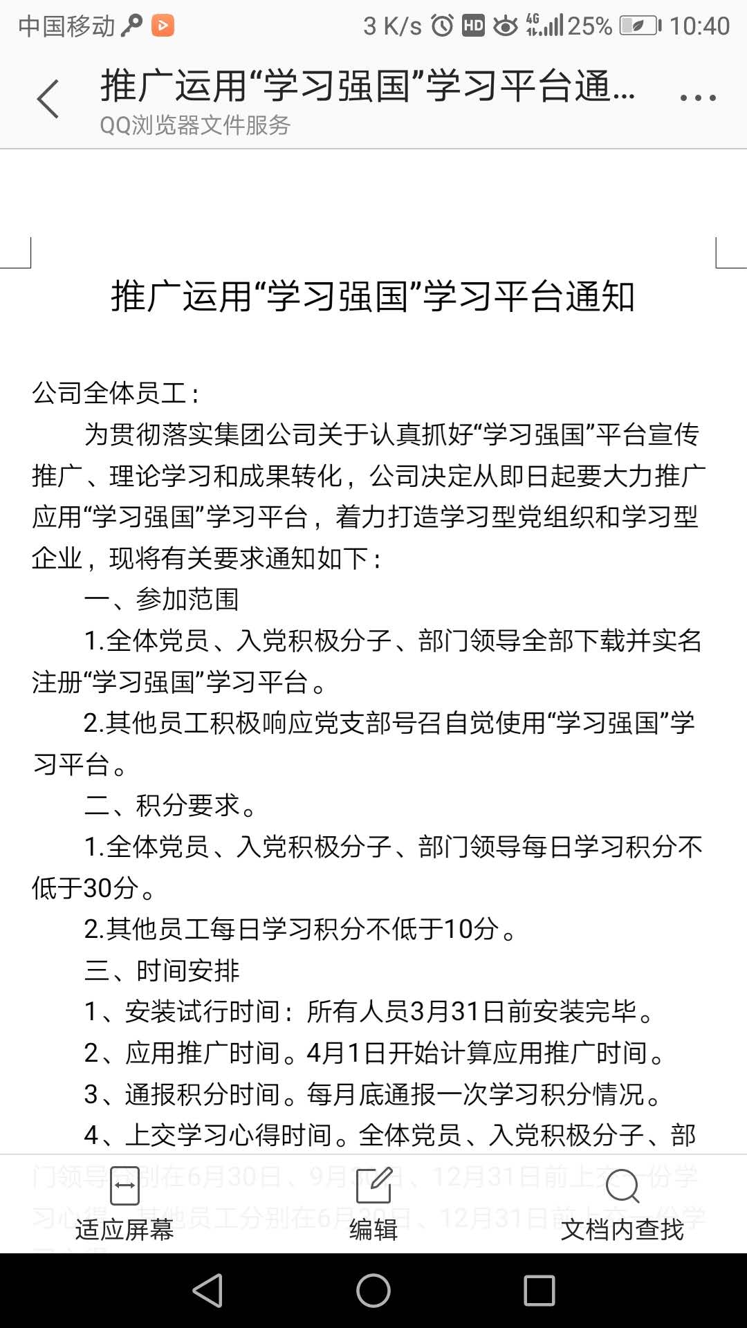 3月29日,公司下发通知后,要求所有人员3月31日前安装完毕,4月1日开始计算应用推广时间,每月底通报一次学习积分情况。全体党员、入党积极分子、部门领导分别在6月30日、9月30日、12月31日前上交一份学习心得。其他员工分别在6月30日、12月31日前上交一份学习心得。公司分别在6月30日、12月31日前召开一次学习交流会,检验学习效果和成果转化情况。在公司召开年终总结会时,由张海东总经理负责讲评此项工作。