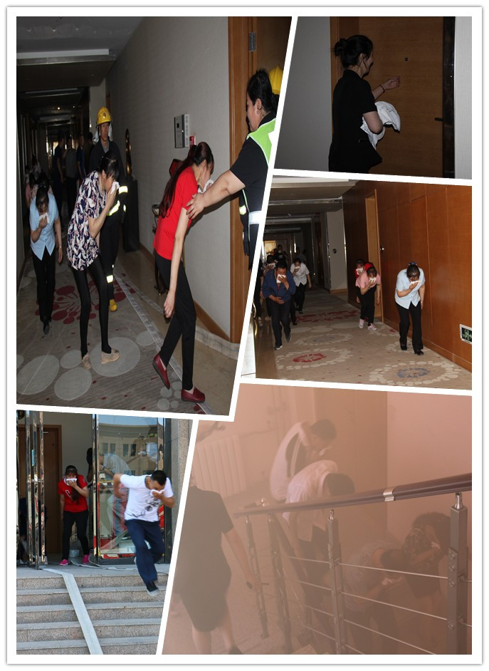 上午10时30分,随着太豪国际酒店消防监控中心消防自动报警系统火灾报警声响起,太豪国际酒店综合灭火疏散演练正式开始。此次演练以模拟酒店5楼509房间着火为情况假想,当消防主机显示客房509房间出现烟感报警后,消防监控中心立即通知当值保安人员和5楼客房人员持通讯工具和灭火器迅速赶到现场查看,在确认火情后就地展开灭火,客房部的其他同伴一边参与灭火,一边疏散客人和员工,组织的有条不紊。消防监控中心在确认火灾后,立即将消防自动报警系统转为自动状态(模拟操作),第一时间拨打了119、120等求救电话。然后向总经理胡生君汇报火灾情况,胡生君总经理得知火灾情况后立即通知各部门负责人启动综合灭火疏散演练预案,同时快速赶到了消防监控中心坐镇指挥。安保部长收到通知后立即呼叫义务消防员、安全员、保安人员集结携带装备器材在2分钟内赶到着火地点展开前期的灭火和救助伤员。消防救援大队赶到酒店后立即组织开展了现场指挥、火情侦察、消防水带铺设、灭火等工作。在消防救援大队和酒店安保人员的共同努力下,大火很快被扑灭。经过清点,酒店所有客人和员工全部安全疏散至后院停车场。及时赶到现场的120急救中心工作人员对部分受伤、昏迷人员进行急救后快速拉往医院救治。