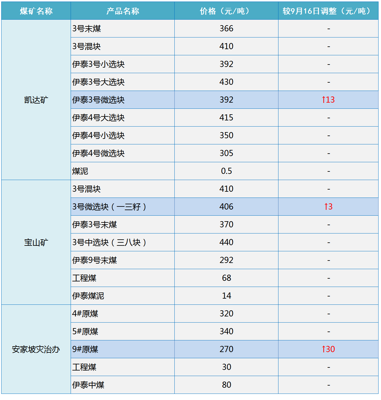 根据伊泰集团2020年9月17日18点更新的销售价格显示,伊泰集团上调部分煤矿煤炭坑口销售价格 3-30元/吨,具体如下:
