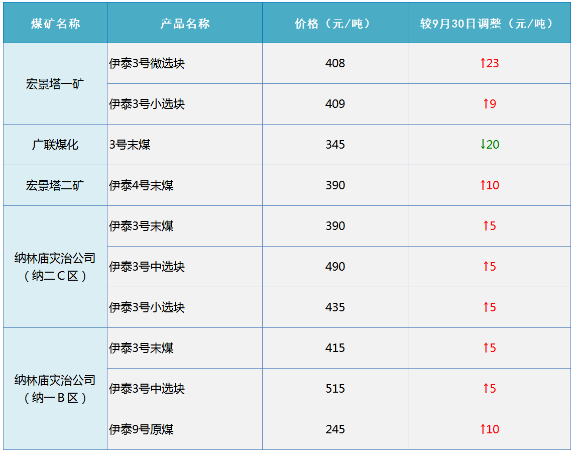10月8日伊泰集团部分煤矿煤炭坑口销售价格较节前调整-20~23元/吨