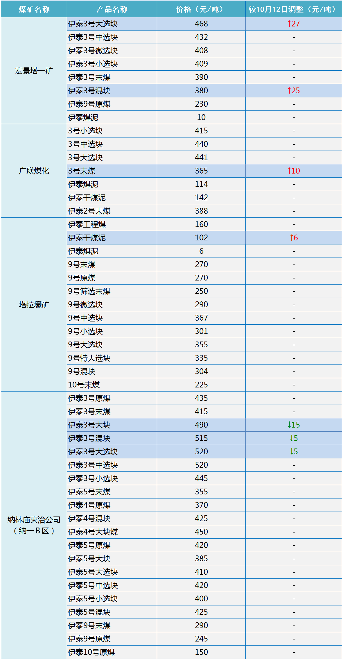 伊泰集团10月13日调整部分煤炭坑口销售价格-15~27元/吨
