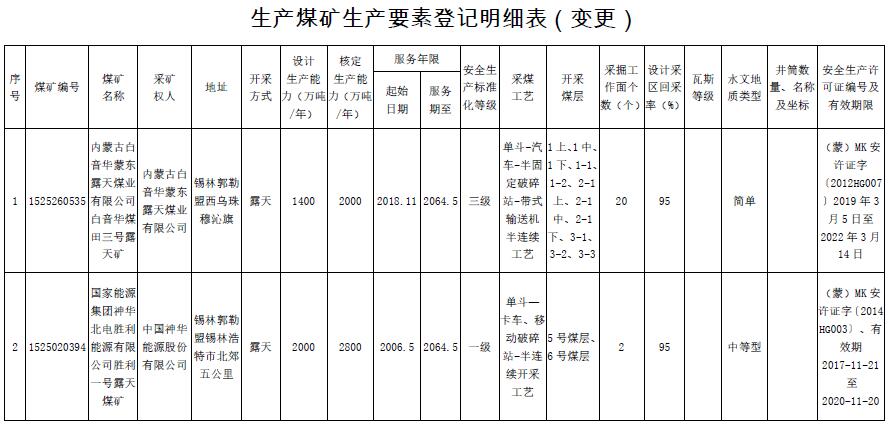 国家能源集团神华北电胜利能源有限公司胜利一号露天煤矿设计生产能力2000万吨/年,国家煤矿安全监察局以“煤安监司办〔2020〕15号”文件同意生产能力核增至2800万吨/年;内蒙古白音华蒙东露天煤业有限公司白音华煤田三号露天矿设计生产能力1400万吨/年,国家煤矿安全监察局以“煤安监司办〔2018〕85号”文件同意生产能力核增至2000万吨/年。据此,按照原内蒙古自治区煤炭工业局《关于建立和完善煤矿生产要素登记公告制度的通知》(内煤局字〔2014〕75号)等要求,现对两矿生产能力等相关要素信息予以变更公告。国家电力投资集团有限公司按照煤安监司办〔2018〕85号要求,及时完善白音华煤田三号露天矿环评等相关手续。本公告同时发布在http://nyj.nmg.gov.cn(内蒙古自治区能源局官方网站)公告专栏。