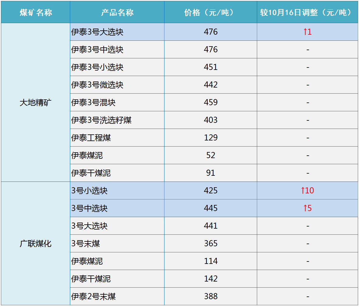 伊泰集团10月18日较上周五上调部分煤炭坑口销售价格1-10元/吨
