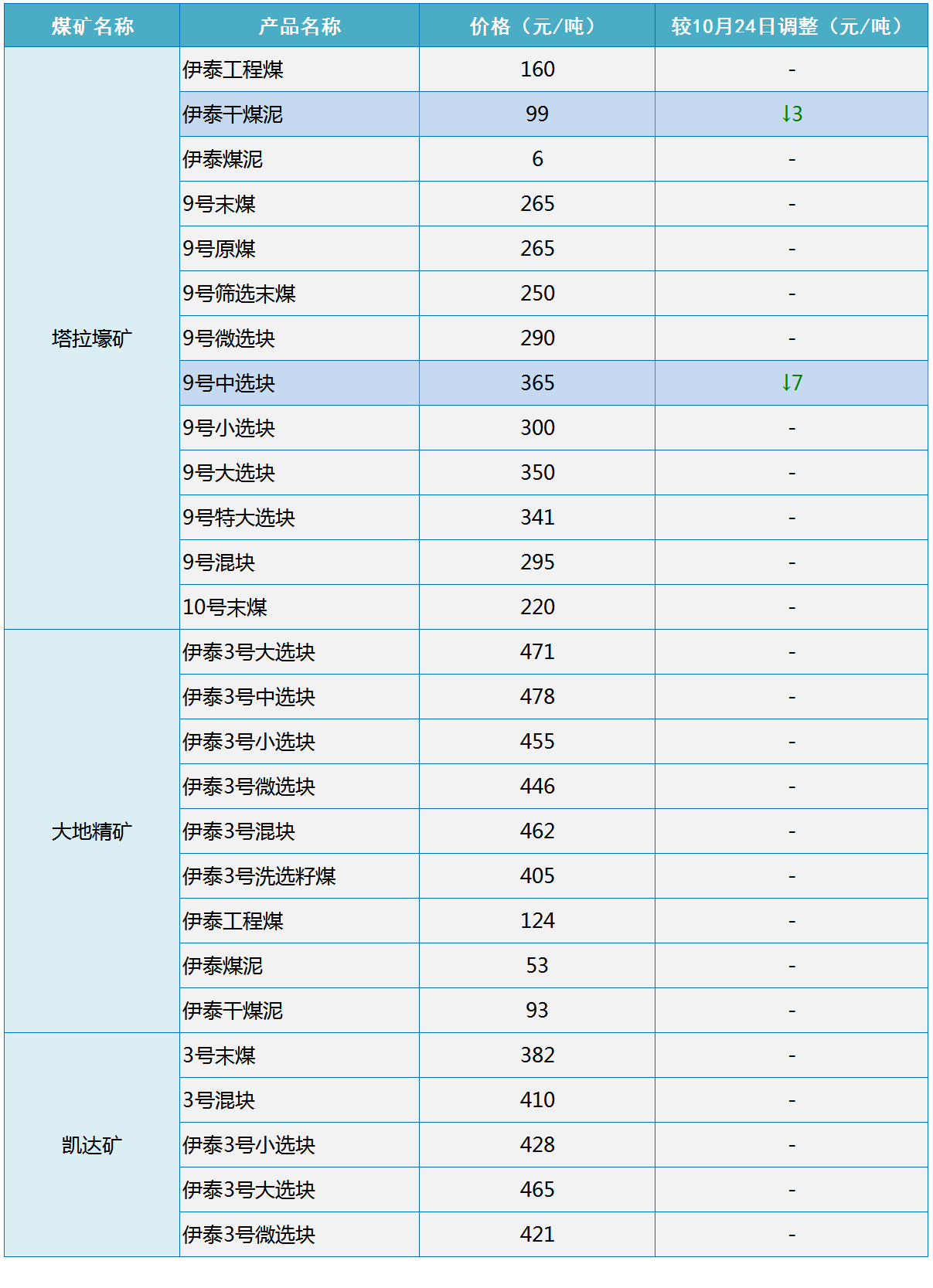 根据伊泰集团2020年10月25日18点更新的销售价格显示,伊泰集团下调塔拉壕矿部分煤炭坑口销售价格3-7元/吨,其他煤矿煤炭坑口销售价格不变。具体如下: