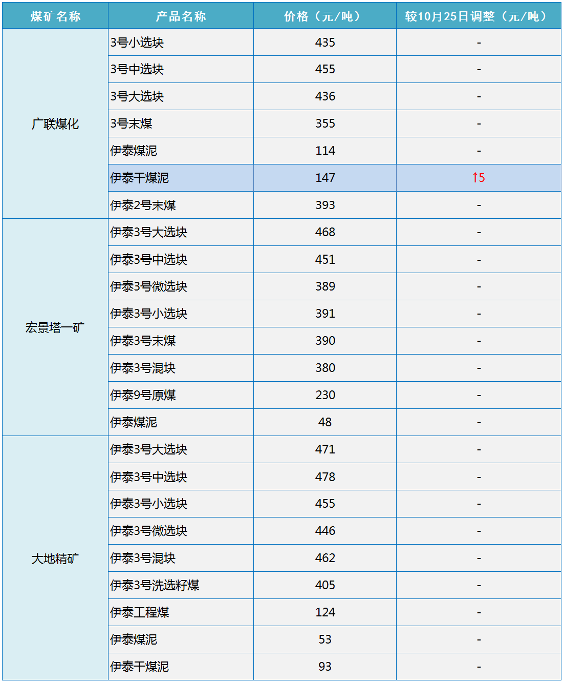根据伊泰集团2020年10月26日18点更新的销售价格显示,伊泰集团上调广联煤化伊泰干煤泥价格5元/吨,其他煤矿煤炭坑口销售价格不变。具体如下: