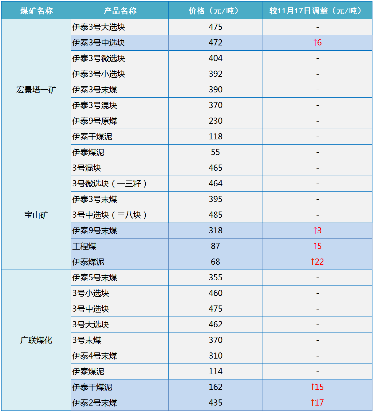 根据伊泰集团2020年11月18日18点更新的销售价格显示,伊泰集团上调部分煤矿煤炭坑口销售价格3-22元/吨,具体如下: