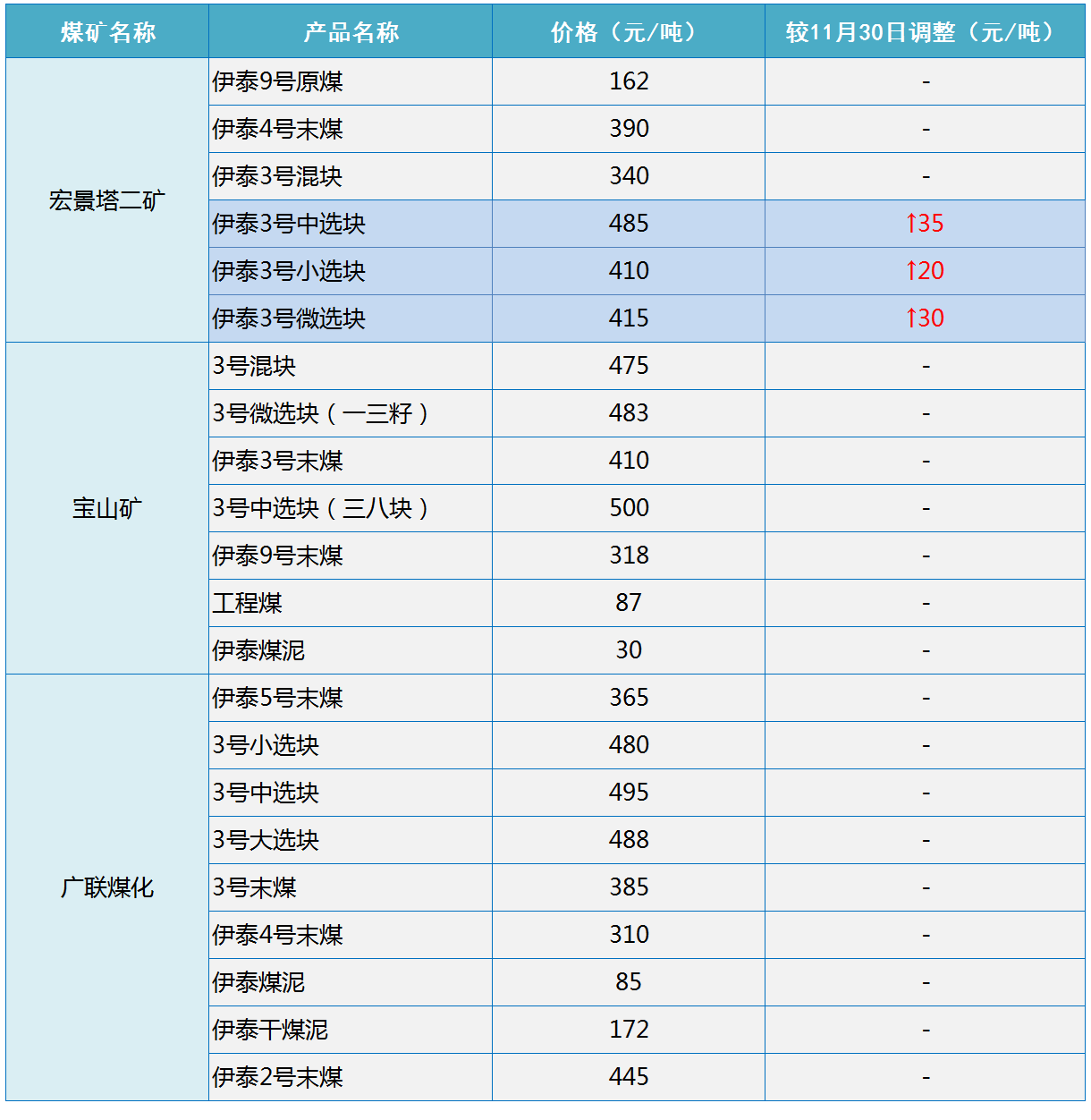 根据伊泰集团2020年12月1日18点更新的销售价格显示,伊泰集团上调宏景塔二矿部分煤炭坑口销售价格20-35元/吨,其他煤矿价格不变。具体如下: