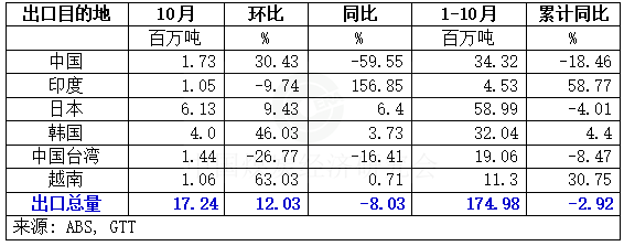 1-10月,澳大利亚动力煤出口量累计为1.75亿吨,比上年同期下降2.92%。其中,出口到印度、韩国和越南等国的煤炭出现较大幅度上升。但同期出口到中国的煤炭同比下降18.46%,出口日本下降4.01%,出口中国台湾地区下降8.47%。