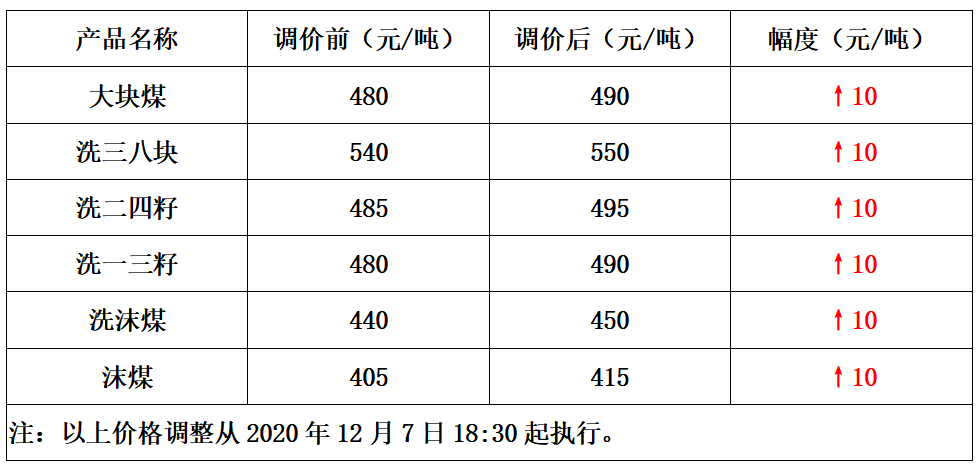 内蒙古铁煤东新公司12月7日上调部分煤炭价格10元/吨