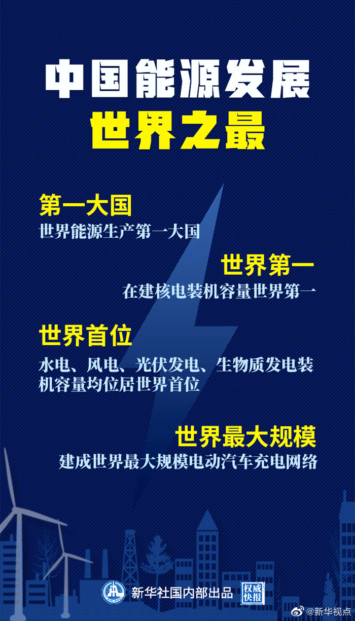 根据国务院新闻办公室21日发布的《新时代的中国能源发展》白皮书,中国能源发展有多个世界之最:初步核算,2019年中国一次能源生产总量达39.7亿吨标准煤,为世界能源生产第一大国;截至2019年底,在运在建核电装机容量6593万千瓦,居世界第二,在建核电装机容量世界第一;截至2019年底,水电、风电、光伏发电、生物质发电装机容量分别达3.56亿千瓦、2.1亿千瓦、2.04亿千瓦、2369万千瓦,均位居世界首位;截至2019年底,全国电动汽车充电基础设施达120万处,建成世界最大规模充电网络。