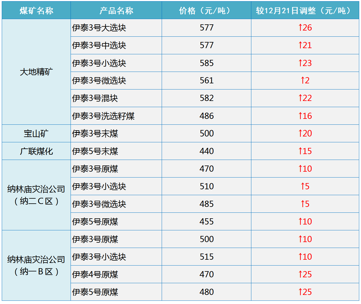 根据伊泰集团2020年12月22日18点更新的销售价格显示,伊泰集团上调部分煤炭坑口销售价格2-26元/吨,具体如下: