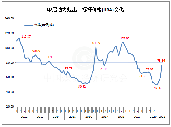 据印度尼西亚能源与矿产资源部(Indonesia's Ministry of Energy and Mineral Resources)发布的指令, 2021年1月份印尼动力煤参考价(Indonesian Coal Price Reference ,HBA)确定为75.84美元/吨,显现连续4个月环比回升,为2019年7月份以来价格最高水平,同比增加9.91美元/吨,增长15.03%;环比上升16.19美元/吨,暴涨27.14%。