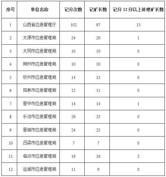 山西省应急管理厅日前公布了2020年山西省煤矿矿长安全生产考核记分工作情况表。2020年1月1日至2020年12月31日,山西省241名矿长被计分。19名矿长在2020年记分周期内累积记分达到12分以上,被责令调离矿长岗位,3年内不得担任煤矿矿长。2名矿长因未履行安全生产职责导致发生较大事故,受到刑事处罚或者撤职处分,5年内不得担任煤矿矿长。