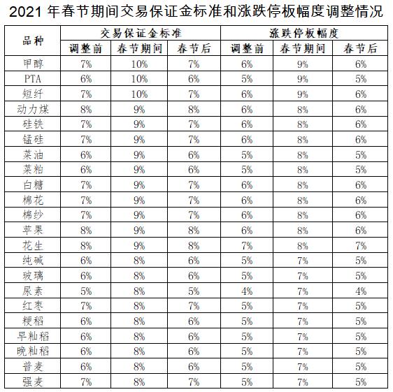 根据《郑州商品交易所期货交易风险控制管理办法》第九条规定,经研究决定,对2021年春节期间部分品种交易保证金标准和涨跌停板幅度作如下调整: