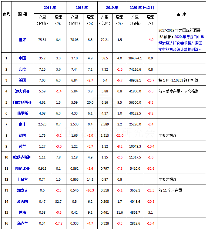 2020年世界主要煤炭生产国产量变化情况