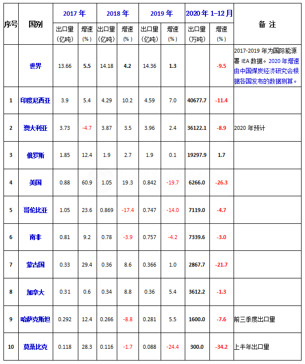 2020年全球主要煤炭出口国出口变化情况