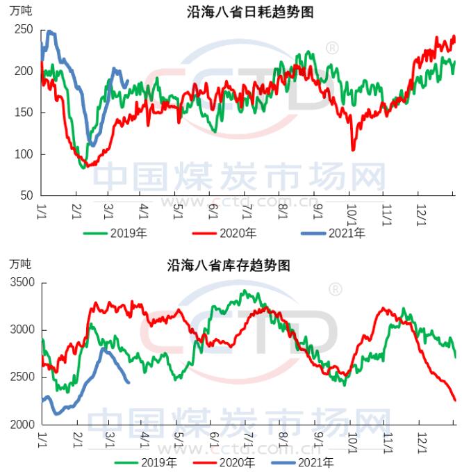 CCTD中国煤炭市场网监测数据显示,截止3月18日,沿海八省煤炭日耗188万吨,较年初低点增加78万吨,同比增加51万吨。沿海八省煤炭库存2441万吨,较年初高点减少358万吨,同比减少741万吨。