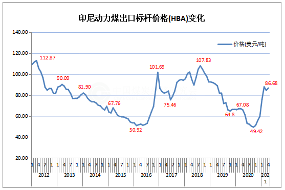 据印度尼西亚能源与矿产资源部(Indonesia's Ministry of Energy and Mineral Resources)发布的信息, 2021年4月份印尼动力煤参考价(Indonesian Coal Price Reference ,HBA)确定为86.68美元/吨,环比提高2.19美元/吨,上升2.59%;同比增加20.91美元/吨,增长31.79%。