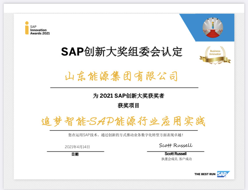 山东能源集团荣膺2021年SAP创新大奖