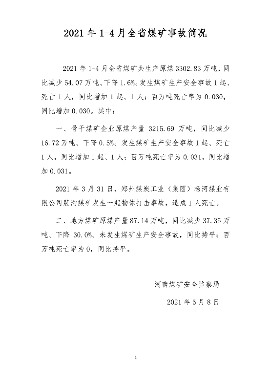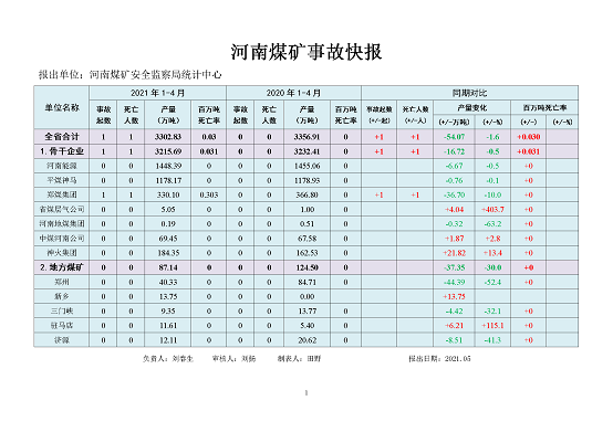 2021年1-4月河南省煤矿事故简况