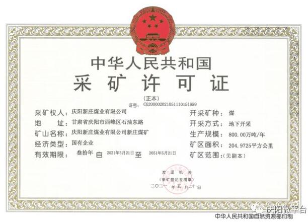5月21日,甘肃省自然资源厅核发了庆阳新庄煤业有限公司新庄煤矿《采矿许可证》。