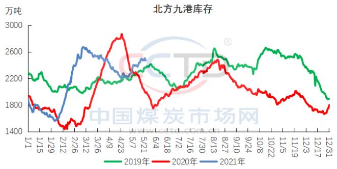 北方港口库存逐步累积。5月份以来,随着大秦线检修结束,发运量增加,港口调入量回升,而受港口长时间大面积封航、高煤价下下游采购节奏放缓等因素影响,港口调出量回落,北方港口库存逐步累积。截止5月23日,环渤海九港(不含天津港)库存为2470万吨,较4月底低点增加273万吨,同比增加489万吨。