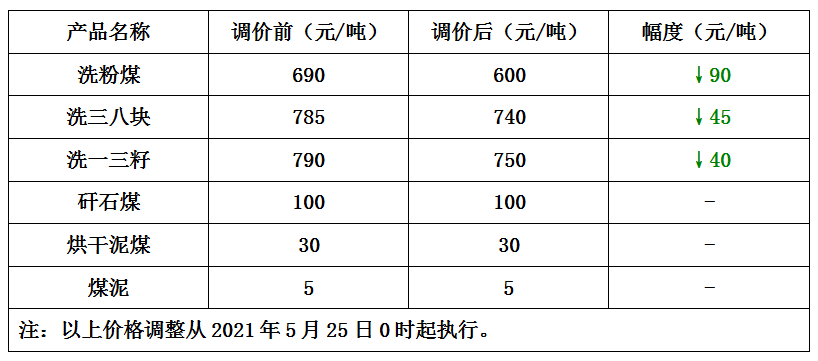 内蒙古益民煤矿5月25日下调部分煤价40-90元/吨