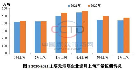 6月份以来,安全事故频发,叠加“七一”百年庆典临近,中央、各地安监力度不断升级,无烟喷吹煤产量释放持续下降。据CCTD监测数据显示,6月上旬,11家主要无烟煤企业煤炭产量同比下降7.8%,月环比下降1.6%。