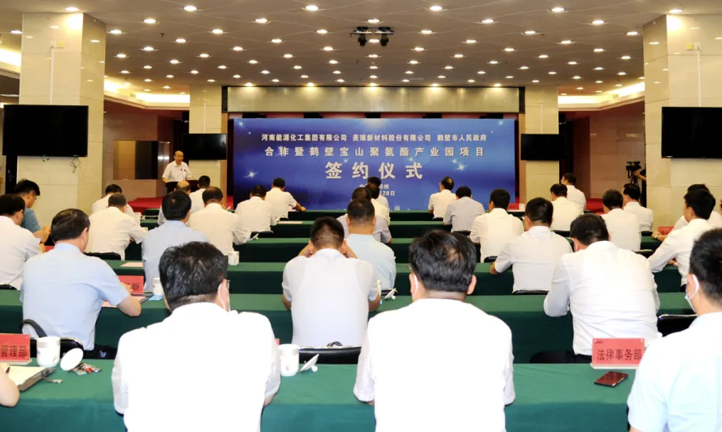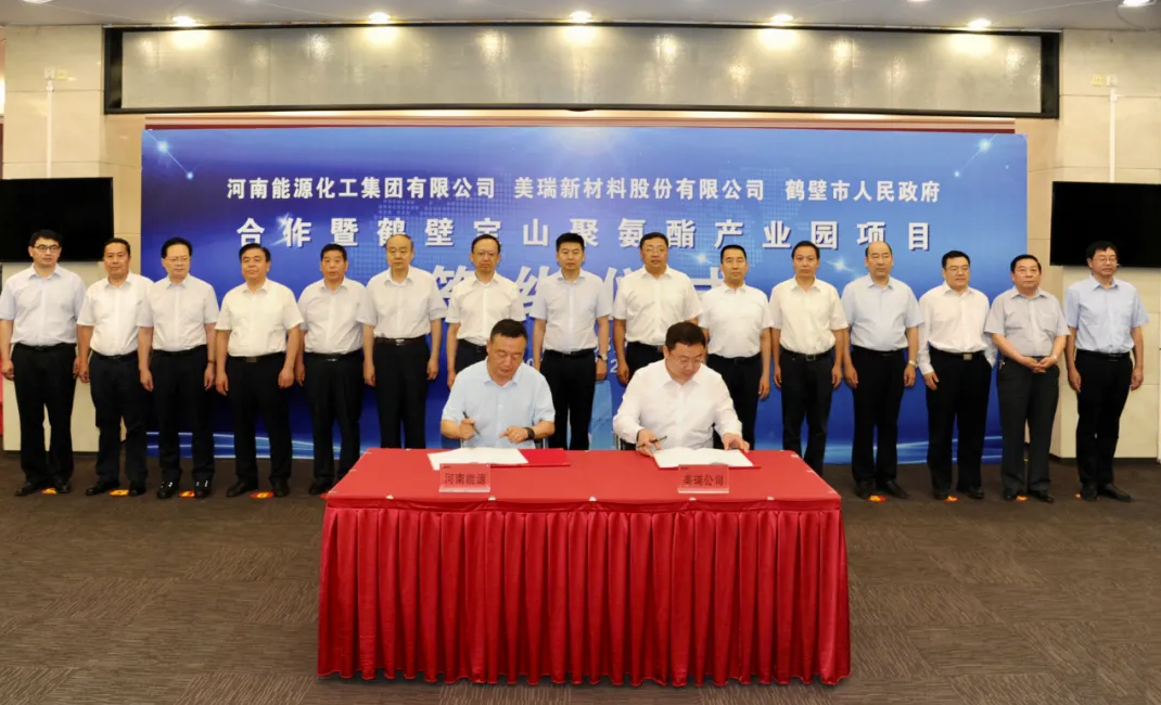 签约仪式上,集团公司化工新材料公司、鹤壁市宝山经开区、鹤壁园区分别与美瑞新材料股份有限公司签订了《聚氨酯新材料产业园项目战略合作协议》、《鹤壁宝山聚氨酯新材料产业园》项目投资协议和《合资经营》协议。