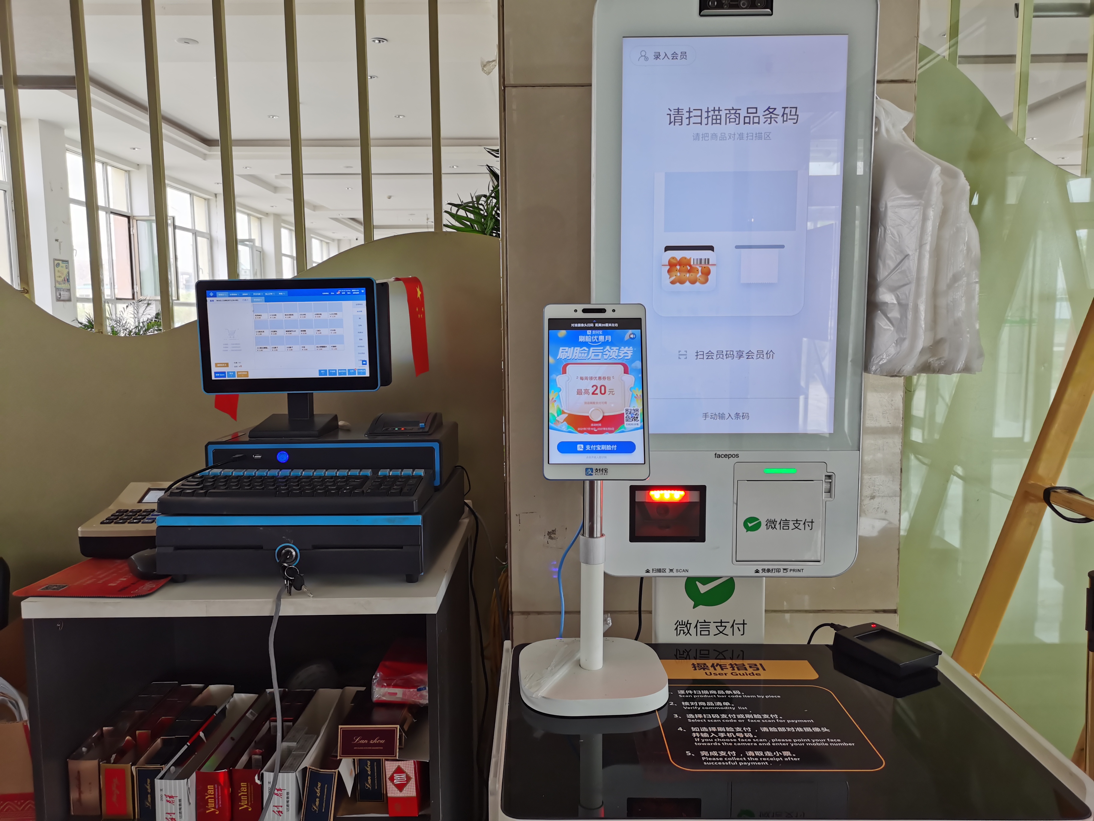 超市分为饮料区、副食品区、自助收银区,各类物品琳琅满目。超市内安装了智能设备,方便支付。超市门禁系统可刷员工卡或微信扫码开关门,商品通过扫描条形码,系统引导至付款页面,支付系统支持微信扫码、支付宝扫码、扫脸支付等方式自助结算,目前员工工牌信息正在逐步录入,工牌支付功能会在本周开放,超市货品也会持续填补更新。