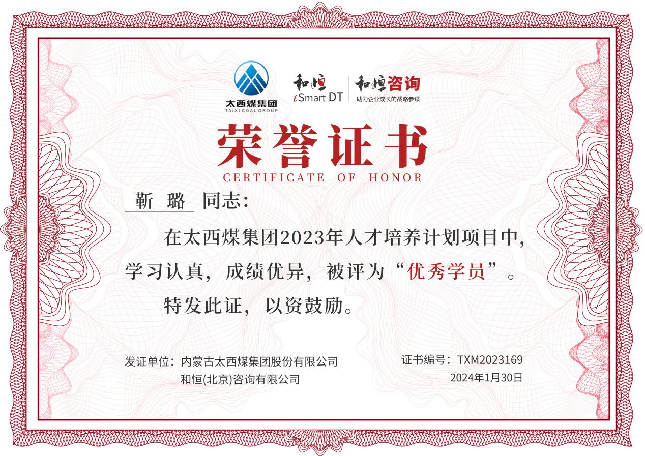 2023年,参加了集团公司人才培养计划人力资源专班,在各位导师的悉心指导下,我深入学习了人才培养工作方式方法、解决问题及工作复盘的重要性,为学员分享了自己提炼实践的《用工合同》方面知识,得到了导师们的高度认可及学员们的一致好评,被评为集团2023年人才培养计划项目的“优秀学员”。