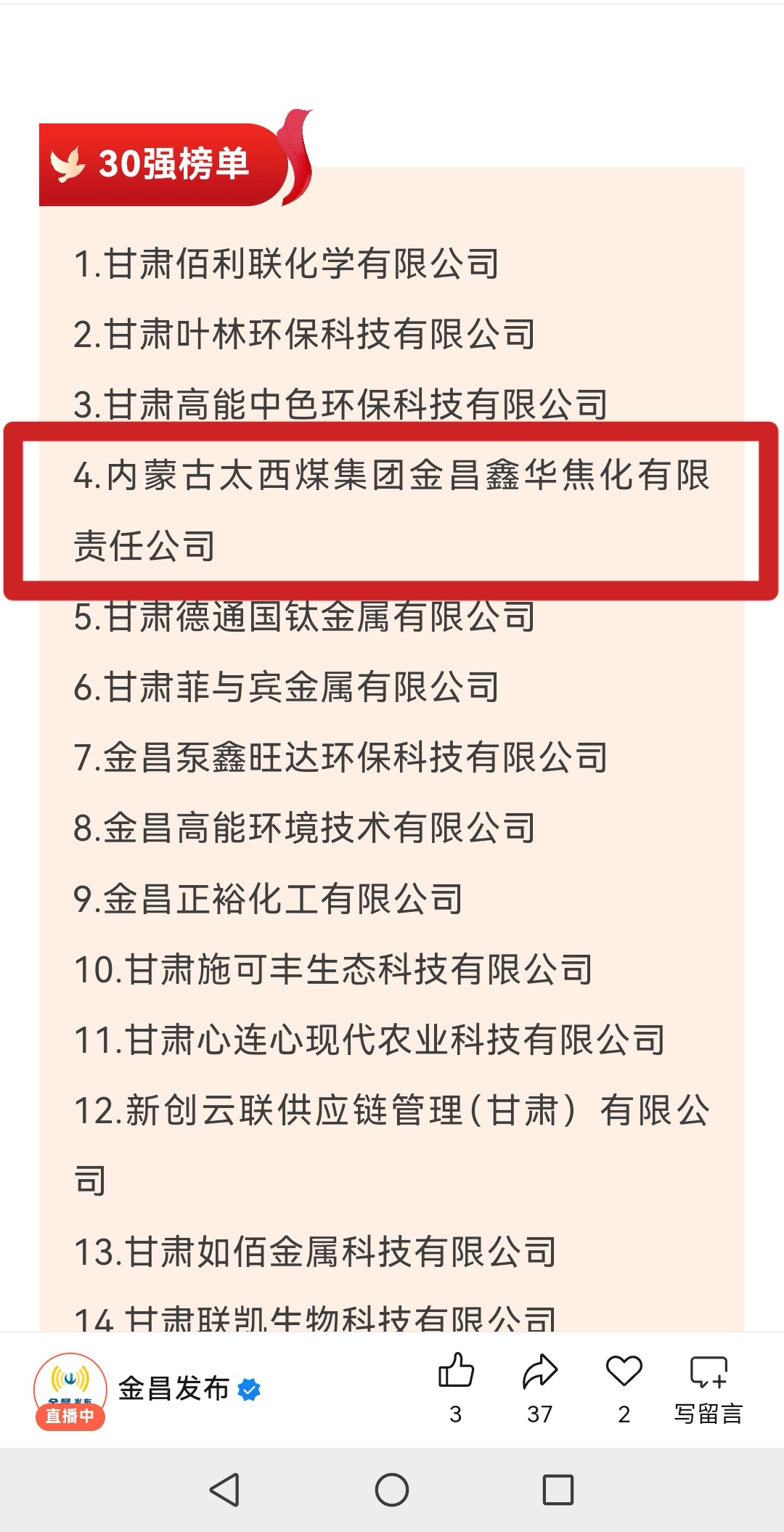 5月26日,金昌市民营企业座谈会暨强工业行动推进大会召开,会上揭晓“2025金昌民营企业30强”。金昌鑫华焦化公司上榜,位列榜单第4。