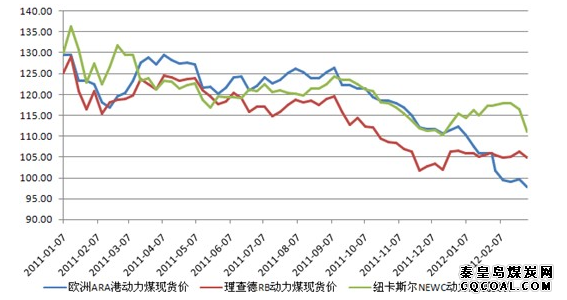 图表1:2011年1月-2012年2月国际三大港口动力煤价格指数走势