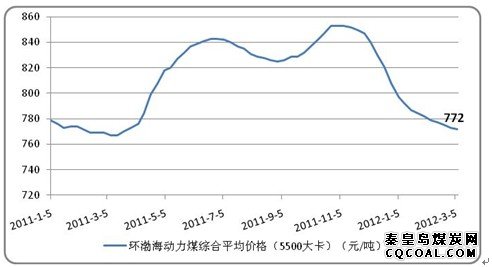 港口方面,受国内煤炭需求提振、主要发运和接卸港口的煤炭库存好转、电煤消费回升、沿海地区煤炭消费企业的采购积极性提高及大秦线检修等多项因素的影响,煤炭供求出现好转,环渤海动力煤价格跌幅收窄。最新发布的环渤海地区港口平仓的发热量5500大卡市场动力煤的综合平均价格小幅下跌,报收于772 元/吨,较上期下跌1元/吨,累计降幅达到81元/吨。